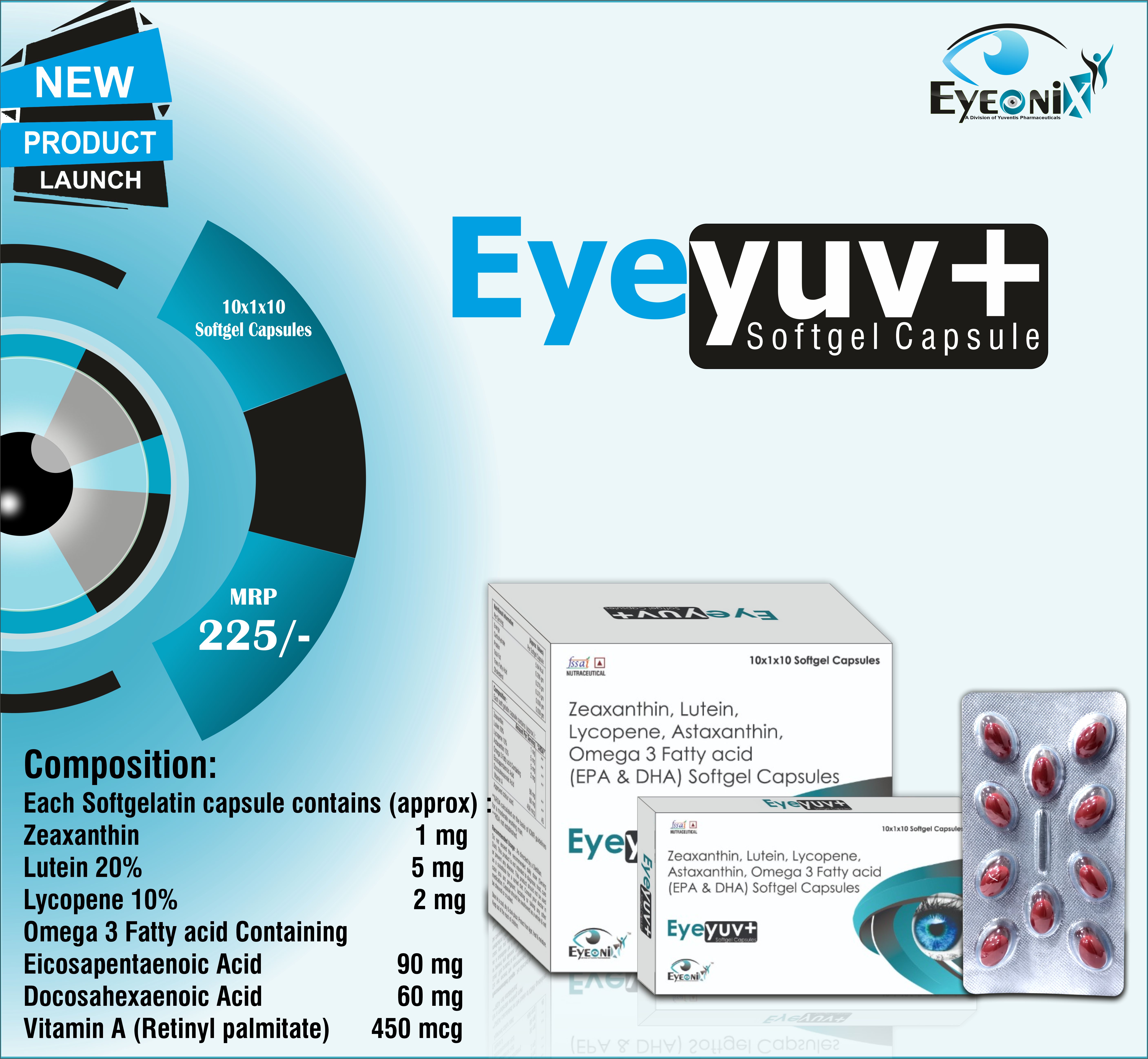Lutein 10% USP 4000 mcg, Lycopene 10% USP 4000 mcg, Betacarotene 30% 5.17 mg, Grape Seed Ext. 10 mg, Selenium Dioxide Monohydrate USP 25 mcg, Zinc Sulphate Monohydrate I.P. 10 mg