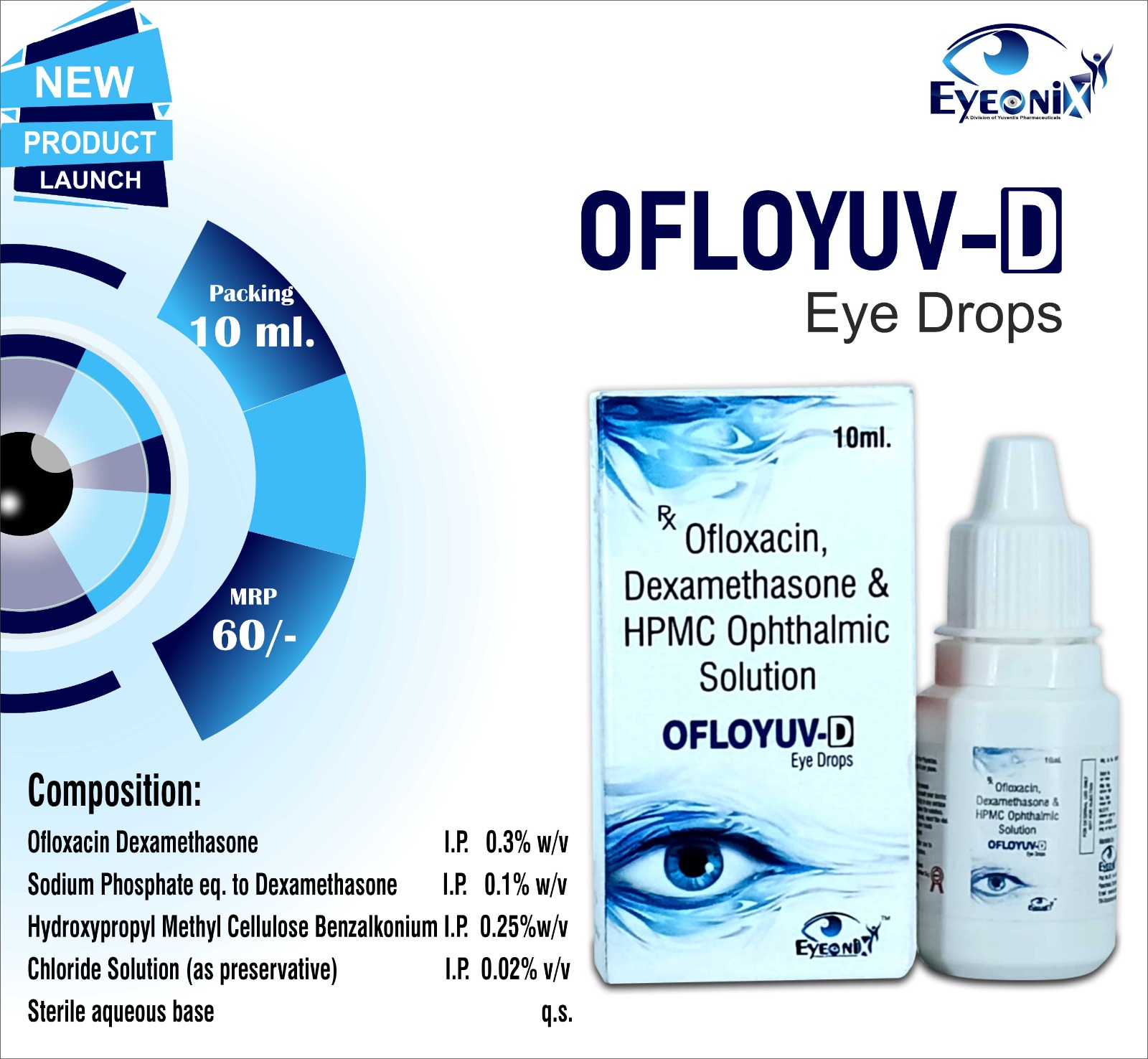 Ofloxacin I.P. 0.3% w/v + Dexamethasone Sodium Phosphate I.P. 0.1% w/v + Hydroxypropyl Methyl Cellulose I.P. 0.25% v/v Eye / Ear Drops